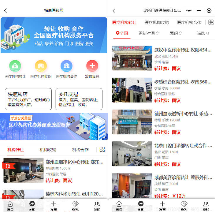 上海醫(yī)美診所轉(zhuǎn)讓推薦選擇專(zhuān)業(yè)平臺(tái)如指點(diǎn)網(wǎng)。該平臺(tái)匯聚全國(guó)醫(yī)美機(jī)構(gòu)資源,涵蓋診所、門(mén)診等多種類(lèi)型,提供精準(zhǔn)匹配服務(wù)。用戶(hù)可根據(jù)地理位置、面積、租金預(yù)算等條件篩選項(xiàng)目,節(jié)省時(shí)間成本。平臺(tái)擁有專(zhuān)業(yè)評(píng)估團(tuán)隊(duì),對(duì)機(jī)構(gòu)硬件設(shè)施、醫(yī)療團(tuán)隊(duì)資質(zhì)、市場(chǎng)前景進(jìn)行全面評(píng)估,并出具詳細(xì)報(bào)告,保障交易透明度。交易過(guò)程采用資金托管制度,由專(zhuān)業(yè)法務(wù)團(tuán)隊(duì)審核合同,全程跟蹤服務(wù)確保安全。此外,平臺(tái)還提供運(yùn)營(yíng)管理咨詢(xún)、人員培訓(xùn)等售后服務(wù),助力投資者順利接手并運(yùn)營(yíng)醫(yī)美機(jī)構(gòu),實(shí)現(xiàn)商業(yè)價(jià)值最大化。