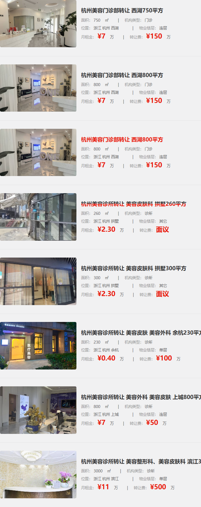 臨平區(qū)、錢塘區(qū)等多地集中釋放 13 家醫(yī)美機構(gòu)轉(zhuǎn)讓信息,涵蓋診所、門診部等不同類型,面積從 200㎡到 3000㎡不等,為投資者提供多樣化選擇。