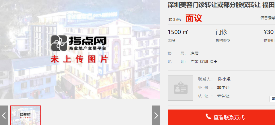 指點網(wǎng)匯聚了海量深圳醫(yī)美轉(zhuǎn)讓資訊,無論您是想要收購一家成熟的醫(yī)美診所,拓展業(yè)務版圖;還是希望轉(zhuǎn)讓經(jīng)營多年的機構(gòu),實現(xiàn)資產(chǎn)變現(xiàn),這里都能滿足您的需求。平臺上信息豐富多樣,涵蓋了不同規(guī)模、不同地段、不同經(jīng)營狀況的醫(yī)美機構(gòu),從高端奢華的大型醫(yī)美醫(yī)院到小巧精致的社區(qū)美容診所,一應俱全。