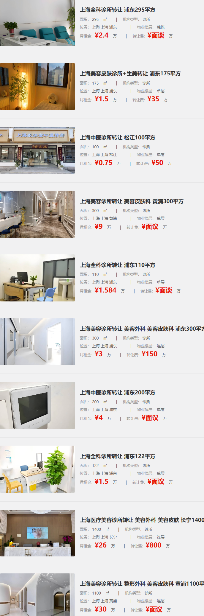 海量精準(zhǔn)信息匯聚于此,涵蓋上海各區(qū)域、各類專科及綜合診所。從繁華的黃浦到活力的浦東,診所的位置、面積、設(shè)備、租金、轉(zhuǎn)讓費(fèi)等關(guān)鍵信息一目了然。信息詳盡助您精準(zhǔn)決策。