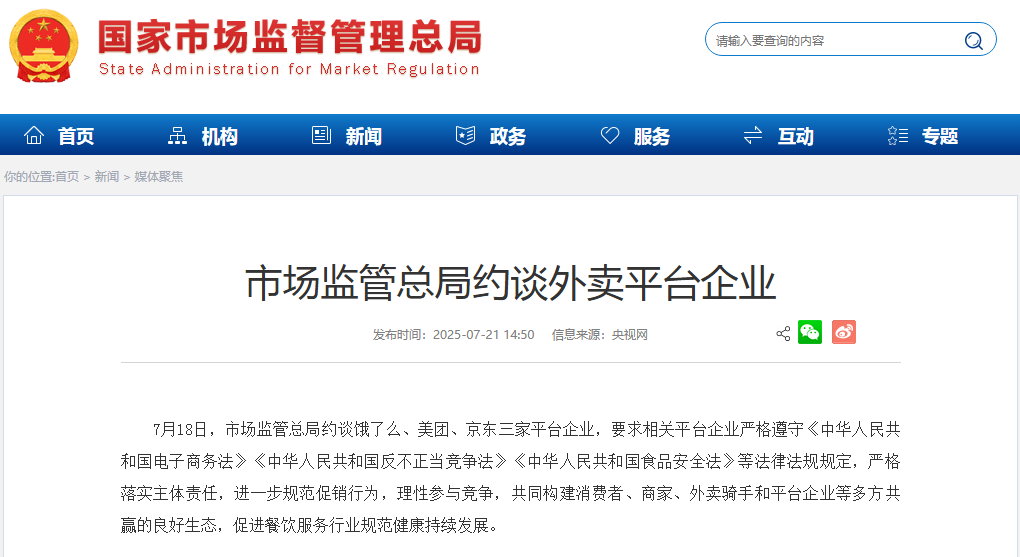 在如今快節(jié)奏的生活里,外賣已經(jīng)成了很多人生活中不可或缺的一部分。打開手機(jī),動動手指,美味佳肴就能很快送到家門口??勺罱赓u行業(yè)里競爭太激烈,有些做法已經(jīng)不太對勁兒了。這不,2025年7月18日,市場監(jiān)管總局坐不住了,直接約談了餓了么、美團(tuán)、京東這三家外賣平臺企業(yè),給它們的競爭行為好好 “劃重點(diǎn)”,要求大家都得理性競爭。