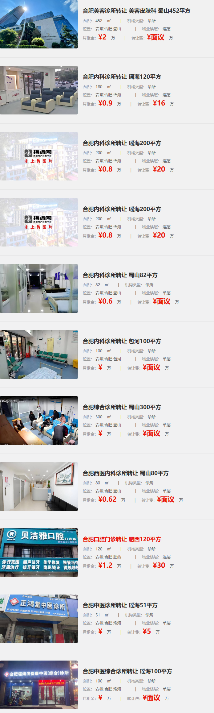 合肥這座飛速發(fā)展的城市,醫(yī)療需求日益旺盛,診所出租轉(zhuǎn)讓市場也隨之活躍。想在合肥找到合適的診所資源?指點網(wǎng)就是你的得力幫手,這里匯聚了海量合肥診所出租轉(zhuǎn)讓信息,為你搭建高效對接的橋梁。