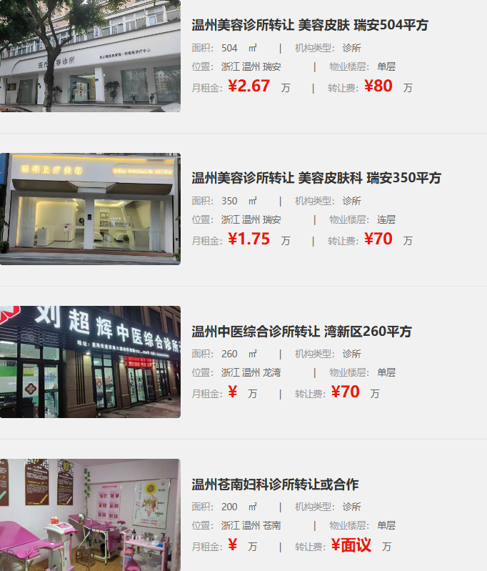 溫州的醫(yī)療市場潛力巨大,無論是繁華的鹿城區(qū),還是新興發(fā)展的甌海區(qū),都有眾多診所面臨經營調整或業(yè)務拓展的需求。指點網(wǎng)憑借其強大的信息整合能力,匯聚了溫州各地豐富的診所出租轉讓信息,涵蓋口腔、中醫(yī)、綜合門診等多個領域,無論您有什么樣的需求,都能在這里找到合適的資源。