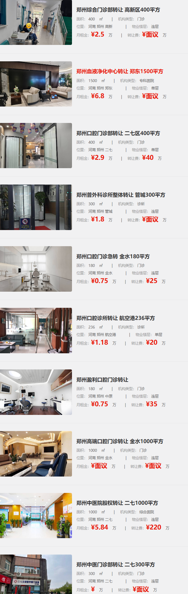 鄭州醫(yī)療市場需求多元,診所出租轉(zhuǎn)讓需求旺盛。指點網(wǎng)以突出的醫(yī)療機構(gòu)轉(zhuǎn)讓優(yōu)勢,助力精準(zhǔn)對接資源。