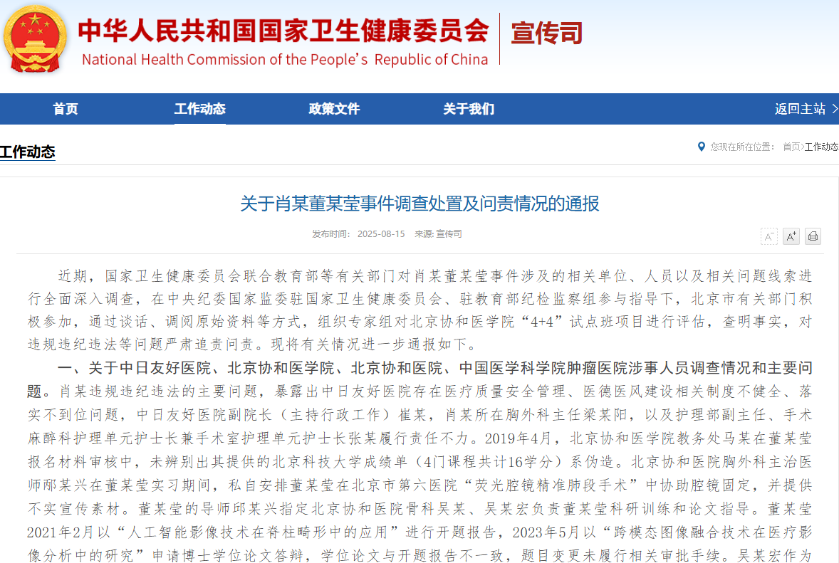近期,國家衛(wèi)生健康委聯(lián)合教育部等有關(guān)部門對肖某、董某瑩事件涉及的相關(guān)單位、人員以及相關(guān)問題線索進行全面深入調(diào)查,北京市有關(guān)部門積極參加,通過談話、調(diào)閱原始資料等方式,組織專家組對北京協(xié)和醫(yī)學院 “4+4” 試點班項目進行評估,查明事實。8 月 15 日,國家衛(wèi)生健康委調(diào)查組就調(diào)查處置及問責情況作出通報。