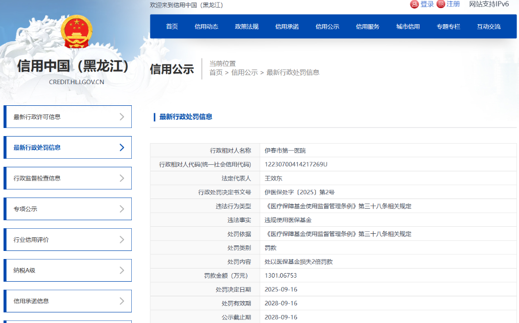 根據(jù)信用中國(黑龍江)平臺公布的處罰決定,伊春市第一醫(yī)院因存在多項醫(yī)?;鹗褂眠`規(guī)行為,被當(dāng)?shù)蒯t(yī)療保障行政部門按照基金損失金額的2倍頂格處罰。這也是今年以來公開披露的金額較大的醫(yī)?;鹛幜P案例之一。