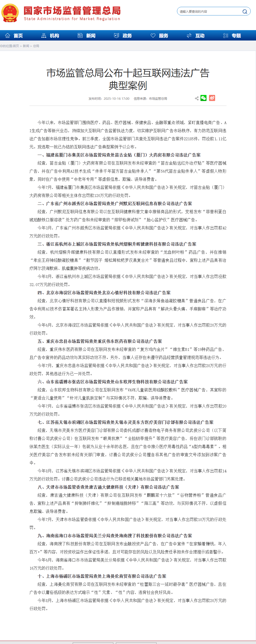 2024 年以來,全國(guó)市場(chǎng)監(jiān)管系統(tǒng)以守護(hù)消費(fèi)者權(quán)益為核心,針對(duì)醫(yī)療、藥品、醫(yī)療器械、保健食品及金融領(lǐng)域開展專項(xiàng)整治,尤其對(duì)直播電商廣告、AI 生成廣告等新業(yè)態(tài)實(shí)施精準(zhǔn)監(jiān)管,堅(jiān)決遏制違法廣告引發(fā)的市場(chǎng)無序競(jìng)爭(zhēng)。據(jù)統(tǒng)計(jì),今年 1-9 月,全國(guó)共立案查處互聯(lián)網(wǎng)違法廣告案件 22185 件,累計(jì)罰沒款項(xiàng)達(dá) 1.11 億元,監(jiān)管執(zhí)法力度與震懾效果同步提升。