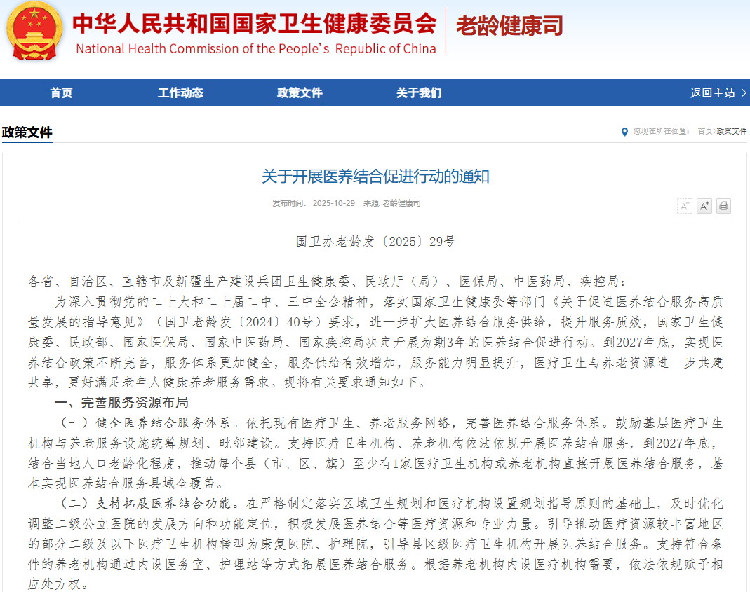 10 月 29 日,國家衛(wèi)生健康委聯(lián)合民政部、國家醫(yī)保局等五部門正式印發(fā)《關(guān)于開展醫(yī)養(yǎng)結(jié)合促進行動的通知》,啟動為期三年的專項行動,明確到 2027 年底實現(xiàn)醫(yī)養(yǎng)結(jié)合服務(wù)縣域全覆蓋、醫(yī)保定點應入盡入的核心目標。這一政策不僅延續(xù)了近年來國家對醫(yī)養(yǎng)結(jié)合的支持導向,更通過 25 項具體任務(wù)構(gòu)建起 “資源整合、服務(wù)升級、保障有力” 的完整體系。