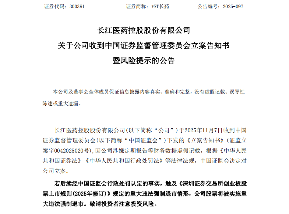 *ST 長藥的處境更為艱難,自 2025 年 11 月 7 日公告被立案調(diào)查以來,股價(jià)已連續(xù)多個(gè)交易日跌停,截至目前跌幅已達(dá) 55%。由于公司原本就面臨凈資產(chǎn)為負(fù)、11 億元有息負(fù)債和 140 起訴訟糾紛等問題,此次財(cái)務(wù)造假立案更是雪上加霜,退市風(fēng)險(xiǎn)高企。投資者紛紛拋售股票避險(xiǎn),形成恐慌性拋售潮,進(jìn)一步加劇股價(jià)下跌。
