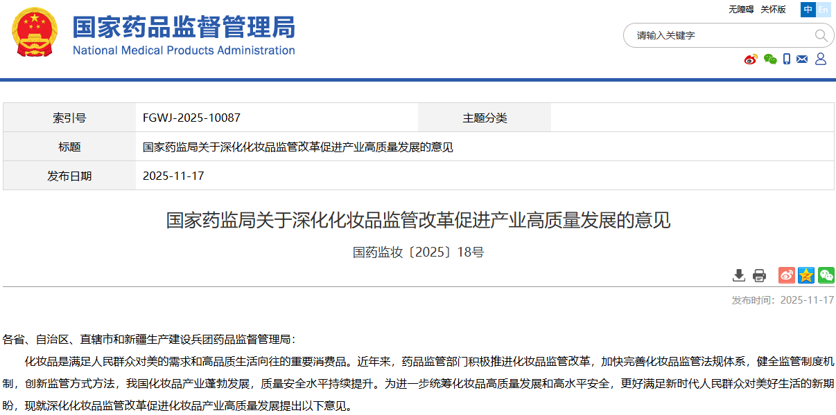 國(guó)家藥監(jiān)局關(guān)于深化化妝品監(jiān)管改革促進(jìn)產(chǎn)業(yè)高質(zhì)量發(fā)展的意見(jiàn)