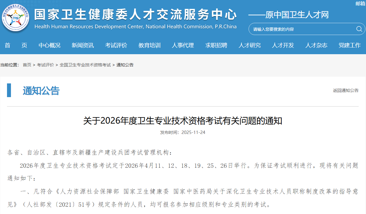 備受全國醫(yī)務(wù)工作者關(guān)注的 2026 年度衛(wèi)生專業(yè)技術(shù)資格(初中級)考試安排正式公布。11 月 24 日,國家衛(wèi)生健康委人才交流服務(wù)中心發(fā)布官方通知,明確考試將于 2026 年 4 月 11 日、12 日、18 日、19 日、25 日、26 日分批次舉行,涵蓋 113 個專業(yè)類別。本次考試延續(xù)多項利好政策,對基層醫(yī)務(wù)人員、規(guī)培合格人員及抗疫一線工作者給予傾斜,報名工作預(yù)計于 2025 年 11 月底至 12 月上旬啟動。