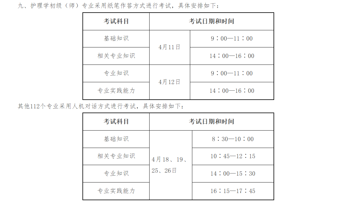 根據(jù)通知要求,2026 年衛(wèi)生初中級職稱考試采用紙筆作答與人機對話兩種方式進行。其中,護理學(xué)初級(師)專業(yè)繼續(xù)沿用紙筆作答模式,考試時間集中在 4 月 11 日、12 日;其余 112 個專業(yè)均采用人機對話方式,考試分批次安排在 4 月 11 日至 12 日、18 日至 19 日、25 日至 26 日三個時間段,具體考試日期將根據(jù)報名情況另行通知,考生需密切關(guān)注官方后續(xù)公告。