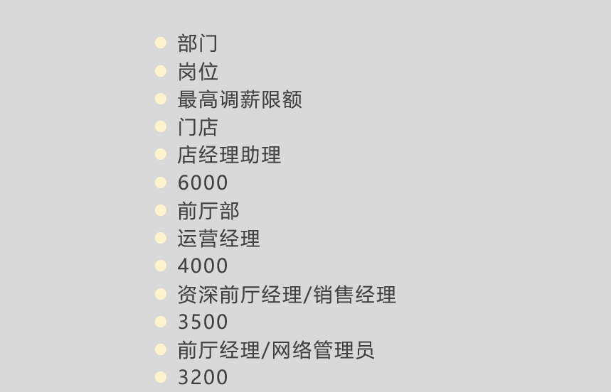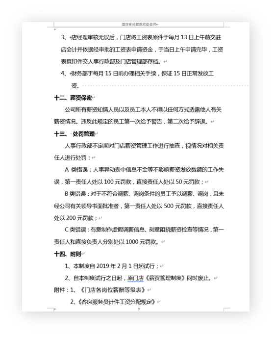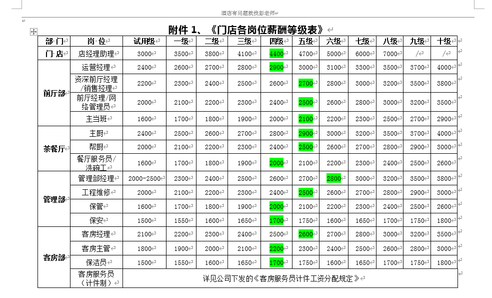 公司將門店每個(gè)崗位的薪酬等級分成十級,每級對應(yīng)的工資標(biāo)準(zhǔn),詳見(附件1)《門店各崗位薪酬等級表》。
