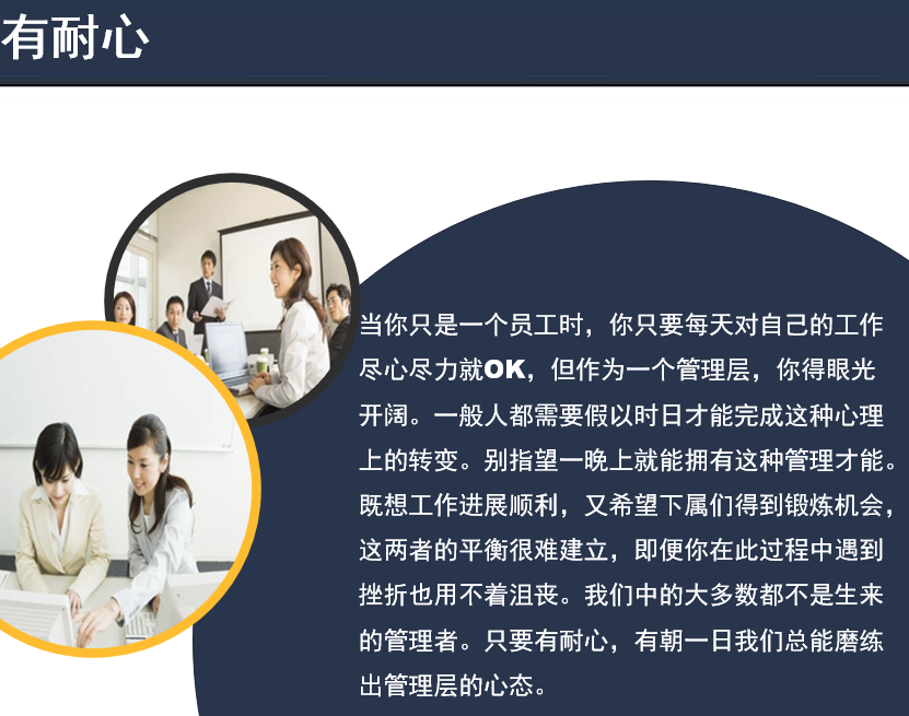 指導(dǎo)別人或者與之合作可不是一個人的事兒,你得改變你自己的一些陋習(xí),但想改變自己很難。你得先學(xué)著發(fā)現(xiàn)下屬們的進步之處,而不是拿他們和你自己作比較。
