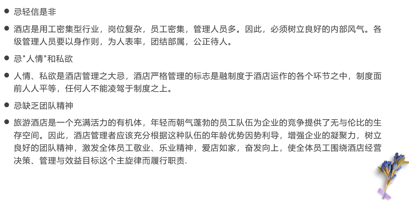 6、酒店管理講究可持續(xù)性,一切工作的計(jì)劃、方案、目標(biāo)、決策必須著眼于酒店的長(zhǎng)遠(yuǎn)利益,維護(hù)酒店永久的生命力和市場(chǎng)競(jìng)爭(zhēng)力。