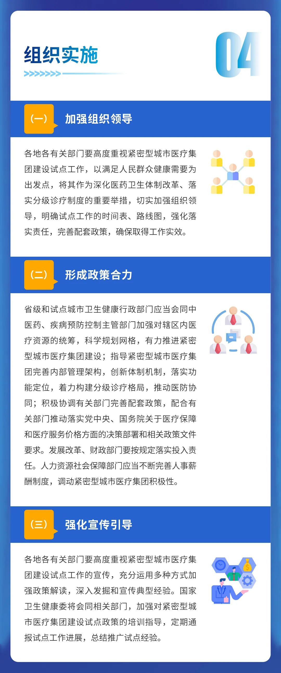 (二)形成政策合力。省級(jí)和試點(diǎn)城市衛(wèi)生健康行政部門(mén)應(yīng)當(dāng)會(huì)同中醫(yī)藥、疾病預(yù)防控制主管部門(mén)加強(qiáng)對(duì)轄區(qū)內(nèi)醫(yī)療資源的統(tǒng)籌,科學(xué)規(guī)劃網(wǎng)格,有力推進(jìn)緊密型城市醫(yī)療集團(tuán)建設(shè);指導(dǎo)緊密型城市醫(yī)療集團(tuán)完善內(nèi)部管理架構(gòu),創(chuàng)新體制機(jī)制,落實(shí)功能定位,著力構(gòu)建分級(jí)診療格局,推動(dòng)醫(yī)防協(xié)同;積極協(xié)調(diào)有關(guān)部門(mén)完善配套政策,配合有關(guān)部門(mén)推動(dòng)落實(shí)黨中央、國(guó)務(wù)院關(guān)于醫(yī)療保障和醫(yī)療服務(wù)價(jià)格方面的決策部署和相關(guān)政策文件要求。發(fā)展改革、財(cái)政部門(mén)要按規(guī)定落實(shí)投入責(zé)任。人力資源社會(huì)保障部門(mén)應(yīng)當(dāng)不斷完善人事薪酬制度,調(diào)動(dòng)緊密型城市醫(yī)療集團(tuán)積極性。
