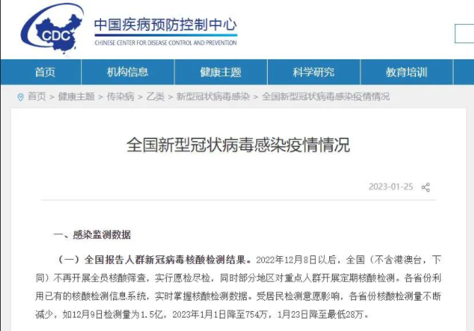 1月25日,中國疾病預(yù)防控制中心官網(wǎng)發(fā)布全國新型冠狀病毒感染疫情情況,在2022年12月22日前后,感染人數(shù)、發(fā)熱門診診療人數(shù)達(dá)到峰值。感染人數(shù)每日最多新增近700萬,發(fā)熱門診診療人次最高峰每日286.7萬,重癥患者數(shù)量最高峰每日增量近1萬,死亡病例數(shù)于1月4日達(dá)到每日峰值4273例。