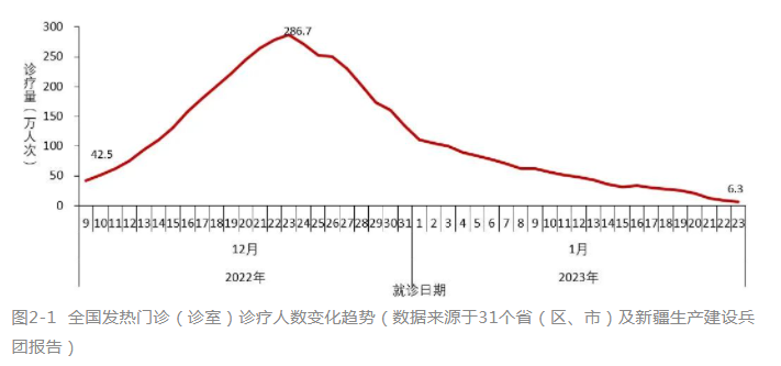 (一)總體就診人數(shù)結(jié)果。全國(不含港澳臺)發(fā)熱門診(診室)就診人數(shù)于2022年12月23日達(dá)到峰值286.7萬人次,隨后連續(xù)下降,2023年1月23日下降到6.3萬人次,較峰值下降了97.8%(圖2-1)。
