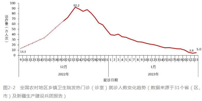 (二)農(nóng)村發(fā)熱門診就診人數(shù)結(jié)果。全國鄉(xiāng)鎮(zhèn)衛(wèi)生院發(fā)熱門診(診室)就診人數(shù)于2022年12月23日達(dá)到峰值92.2萬人次,隨后波動下降,2023年1月23日下降至5.0萬人次,較峰值下降了94.6%(圖2-2)。