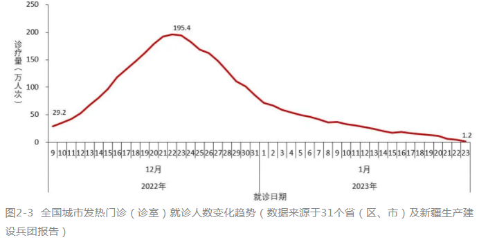 (三)城市發(fā)熱門診就診人數(shù)結(jié)果。全國二級以上醫(yī)療機構(gòu)和城市社區(qū)衛(wèi)生服務(wù)中心發(fā)熱門診(診室)就診人數(shù)于2022年12月22日達(dá)到峰值195.4萬人次,隨后連續(xù)下降,2023年1月23日下降至1.2萬人次,較峰值下降了99.4%(圖2-3)。