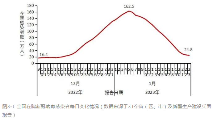 (一)在院新冠病毒感染者結(jié)果。全國在院新冠感染者于2023年1月5日達(dá)到峰值162.5萬人,隨后持續(xù)下降,1月23日下降至24.8萬人,較峰值減少了84.8%(圖3-1)。
