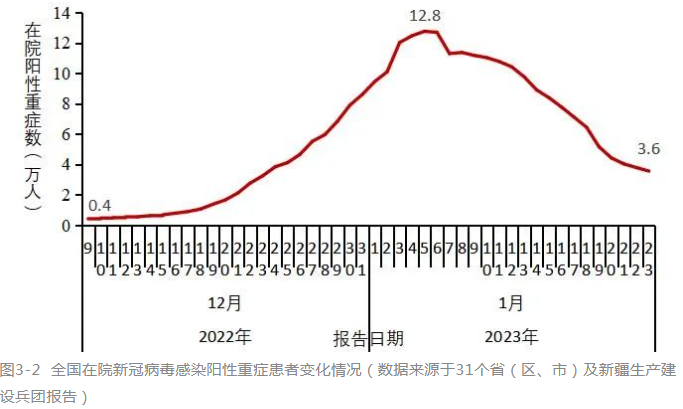 (二)在院新冠病毒感染陽性重癥患者結(jié)果。全國在院新冠病毒感染者中,重癥患者數(shù)量于2022年12月27日至2023年1月3日期間每日增量近1萬,1月4日增量明顯下降,1月5日達(dá)到峰值12.8萬,隨后持續(xù)下降,1月23日下降至3.6萬,較峰值下降了72.0%(圖3-2)。