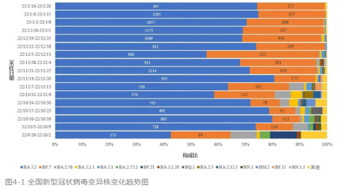 (二)12月以來本土病例病毒變異株監(jiān)測情況。2022年12月1日至2023年1月23日,全國共報送10165例本土病例新冠病毒基因組有效序列,全部為奧密克戎變異株,共存在24個進(jìn)化分支。主要流行株為BA.5.2(70.2%)和BF.7(28.3%)(表4-1)。共發(fā)現(xiàn)重點關(guān)注變異株11例,其中1例XBB.1、1例BQ.1.1.17、4例BQ.1.1、3例BQ.1.2和2例BQ.1.8。