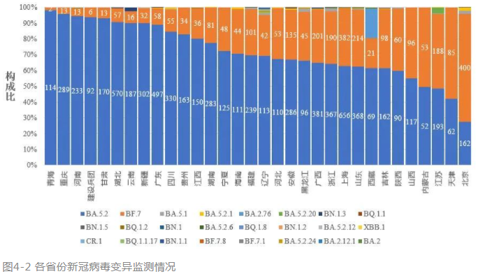 (三)新冠病毒變異分省份情況。北京和天津以BF.7為優(yōu)勢株;江蘇和內(nèi)蒙古BF.7和BA.5.2基本持平;其他省份均以BA.5.2為優(yōu)勢株(圖4-2)。