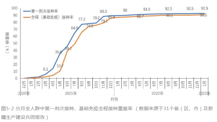 2020年12月15日全國啟動新冠病毒疫苗大規(guī)模接種后,接種速度明顯加快,5天完成1億劑次接種,單日最高接種2474萬劑次。我國積極穩(wěn)妥推進(jìn)接種工作,截至2023年1月20日,累計完成接種34.88億劑次(圖5-1)。全人群第一劑次、全程接種覆蓋比例分別達(dá)到92.9%和90.5%(圖5-2)。