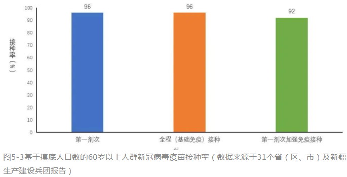 根據(jù)近期開展的老年人專項摸底調(diào)查數(shù)據(jù),60歲以上老年人接種覆蓋人數(shù)占老年人群的96%。全程接種、第一劑次加強免疫接種人數(shù)分別占符合接種時間間隔老年人群的96%、92%(圖5-3)。