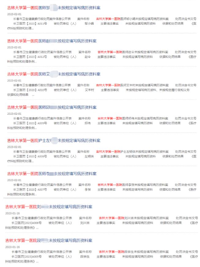 行政處罰信息顯示,1月11日,吉林大學(xué)第一醫(yī)院段某某、劉某某,因未按規(guī)定填寫(xiě)病歷資料,被當(dāng)?shù)匦l(wèi)健委給予警告、罰款1萬(wàn)元。1月29日,該院醫(yī)師李某、邱某、趙某以及護(hù)士左某某,再次因同樣原因受到處罰。