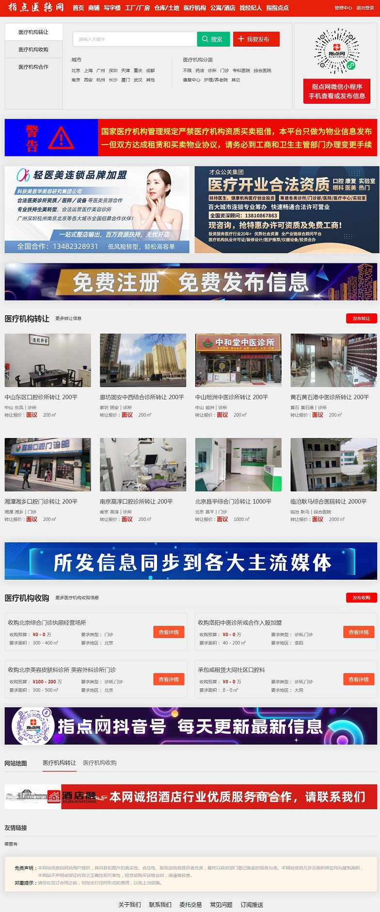 目前市場(chǎng)上還沒有一個(gè)專業(yè)的醫(yī)療機(jī)構(gòu)轉(zhuǎn)讓平臺(tái),指點(diǎn)網(wǎng)https://yl.shangpu99.com/是免費(fèi)發(fā)布信息。重點(diǎn)著手專注于民營(yíng)醫(yī)療機(jī)構(gòu)轉(zhuǎn)讓業(yè)務(wù),有想轉(zhuǎn)讓或想收購的都可以免費(fèi)注冊(cè)發(fā)布信息。
