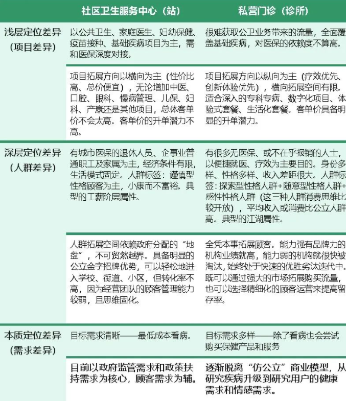 雖然同為基層醫(yī)療機(jī)構(gòu),進(jìn)入社區(qū)衛(wèi)生服務(wù)中心的顧客和進(jìn)入私營(yíng)門(mén)診的顧客,無(wú)論從畫(huà)像上、還是需求上,都有著較大區(qū)別。
