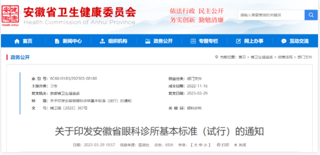 3月29日,安徽省衛(wèi)健委發(fā)布了一則政策文件《關于印發(fā)安徽省眼科診所基本標準(試行)的通知》,明確了安徽省眼科診所的設置標準和準入標準。這是自廣東省2013年發(fā)布眼科診所的設置標準以來,又一關于眼科診所標準的地方性行業(yè)標準文件。
