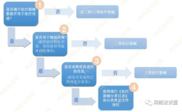 而根據(jù)《人工智能醫(yī)用軟件產品分類界定指導原則》,如果產品不涉及診斷和治療功能,或僅用于健康管理,目標人群為健康人群,預期用于分析統(tǒng)計健康信息,則被納入醫(yī)療器械監(jiān)管的可能性較低。相反,預期用于疾病管理,目標人群為專業(yè)醫(yī)護人員和患者,監(jiān)測和處理醫(yī)療數(shù)據(jù)/圖像,原則上都有可能被認定為醫(yī)療器械。具體的分類界定步驟筆者整理如下: