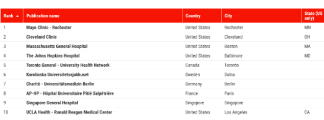 近日,美國《新聞周刊》(Newsweek)和全球數(shù)據(jù)公司Statista合作,評選出了“2023年世界最佳醫(yī)院”,該榜單已連續(xù)發(fā)布多年,通過對來自28個國家和地區(qū)的2300多家醫(yī)院的聲譽和績效進行基于數(shù)據(jù)的比較,進行排名,這些醫(yī)院已經(jīng)存在了至少幾十年甚至上百年,其中梅奧診所依舊蟬聯(lián)第一的寶座。