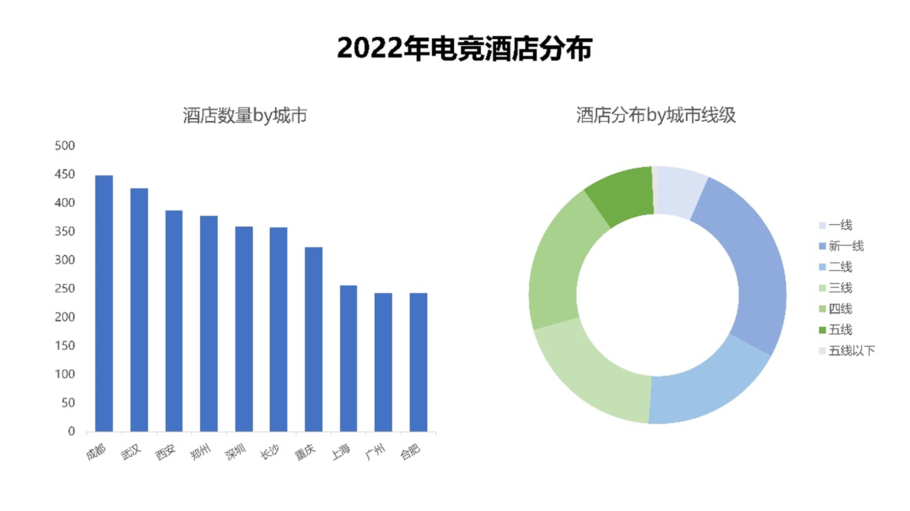 2.1 中國電競酒店發(fā)展背景及現(xiàn)狀電競酒店是依托于電競產(chǎn)業(yè)及住宿產(chǎn)業(yè),融合“酒店+電競”兩種業(yè)態(tài),為消費者提供高品質(zhì)電競體驗、同時滿足消費者住宿社交需求的新型跨界產(chǎn)品。本質(zhì)上,電競酒店是住宿業(yè)態(tài)向內(nèi)容服務(wù)衍生的一種探索,屬于電競產(chǎn)業(yè)鏈的消費和衍生端。自2017年國內(nèi)第一家電競酒店在鄭州誕生以來,武漢、重慶、成都、西安等地的電競酒店逐漸發(fā)展壯大,目前在全國31個省市均有電競酒店發(fā)展的身影。國內(nèi)電競酒店根據(jù)是否專營可以分為兩類,一類是完全根據(jù)電競用戶需求來運營的專業(yè)電競酒店,如愛電競、格林電競等;另一類則是在原有酒店基礎(chǔ)上,升級部分房型為電競主題房,多以連鎖酒店為主,如香格里拉集團(tuán)就曾發(fā)布與騰訊游戲聯(lián)合定制的電競主題房。數(shù)智酒店數(shù)據(jù)顯示,2022年,全國電競酒店門店總數(shù)達(dá)1.4萬余家。電競酒店主要分布在新一線、二線及以下城市,成都、武漢、西安、鄭州、深圳、長沙、重慶、上海、廣州、合肥等城市電競酒店數(shù)量位列前十。