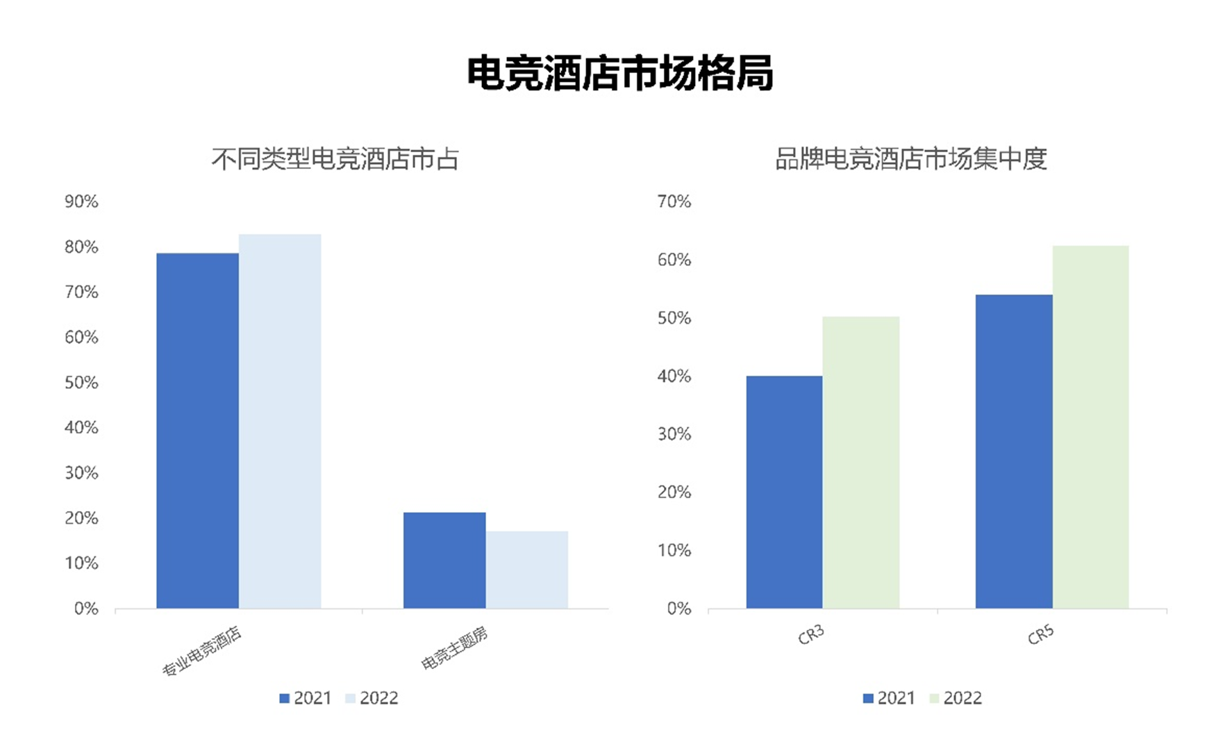 2.3 中國電競酒店市場格局數(shù)智酒店測算,2022年專業(yè)電競酒店的市占達(dá)82%,而電競主題房市占達(dá)18%,專業(yè)電競酒店的市場份額同比2021年提高了4pp。同時,專業(yè)電競酒店的市場集中度也在不斷增強(qiáng)。經(jīng)測算,品牌電競酒店市場(不含非品牌酒店)的CR3、CR5同比2021年分別提高了10pp, 8pp。可以預(yù)期,電競酒店市場向著專業(yè)化、品牌化發(fā)展,專業(yè)電競酒店品牌正逐步擴(kuò)大規(guī)模。