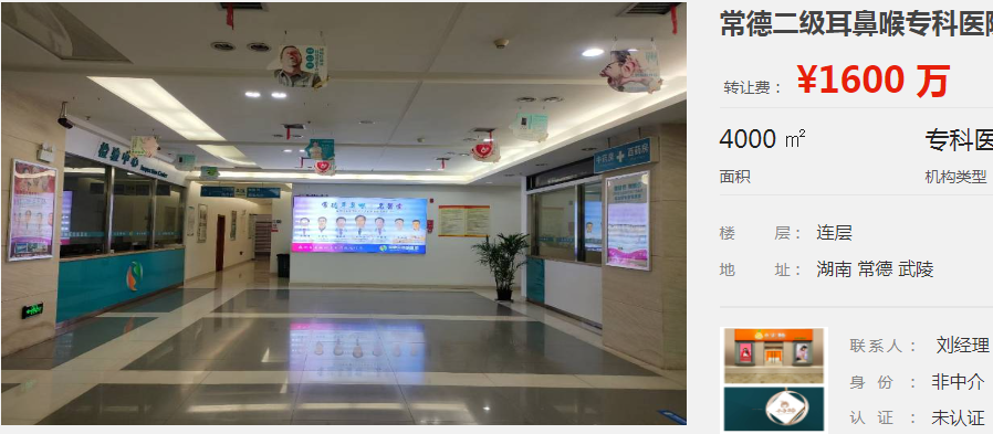 常德唯一一家耳鼻喉醫(yī)院 ,經(jīng)營10多年的老品牌,患者可輻射至張家界,東鵬的瓷磚 大理石的導診臺,裝修很好,位于友阿和大潤發(fā)旁邊地理位置優(yōu)越,醫(yī)保定點單位,股權無糾紛,資產(chǎn)良性,老板來長沙布局線上醫(yī)療管理,決定低價轉(zhuǎn)讓,之前投了將近4000萬,營銷又花了幾千萬,可以說是白菜價轉(zhuǎn)了 懂行的來
