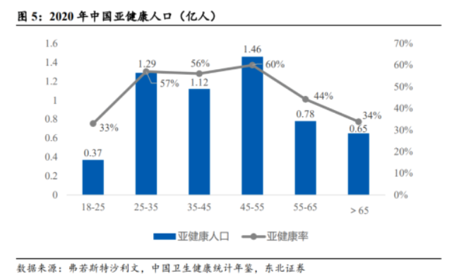根據(jù)弗若斯特沙利文估計,2020年中國18歲以上亞健康人口總計約5.7億人,規(guī)模龐大。亞健康人口集中于中青年階段,25-55歲的亞健康人口約3.9億人,亞健康率近60%。