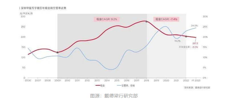根據(jù)戴德梁行的報道,2023年上半年,深圳甲級寫字樓市場持續(xù)供應過剩,導致整體空置率上升。上半年的空置率為24.5%,比去年同期上升了1.6個百分點。由于供應過剩,深圳甲級寫字樓市場的平均租金繼續(xù)下降,下降了3.0%,達到每月每平米197.5元。與歷史高點相比,平均租金已經(jīng)下調了28.6%。