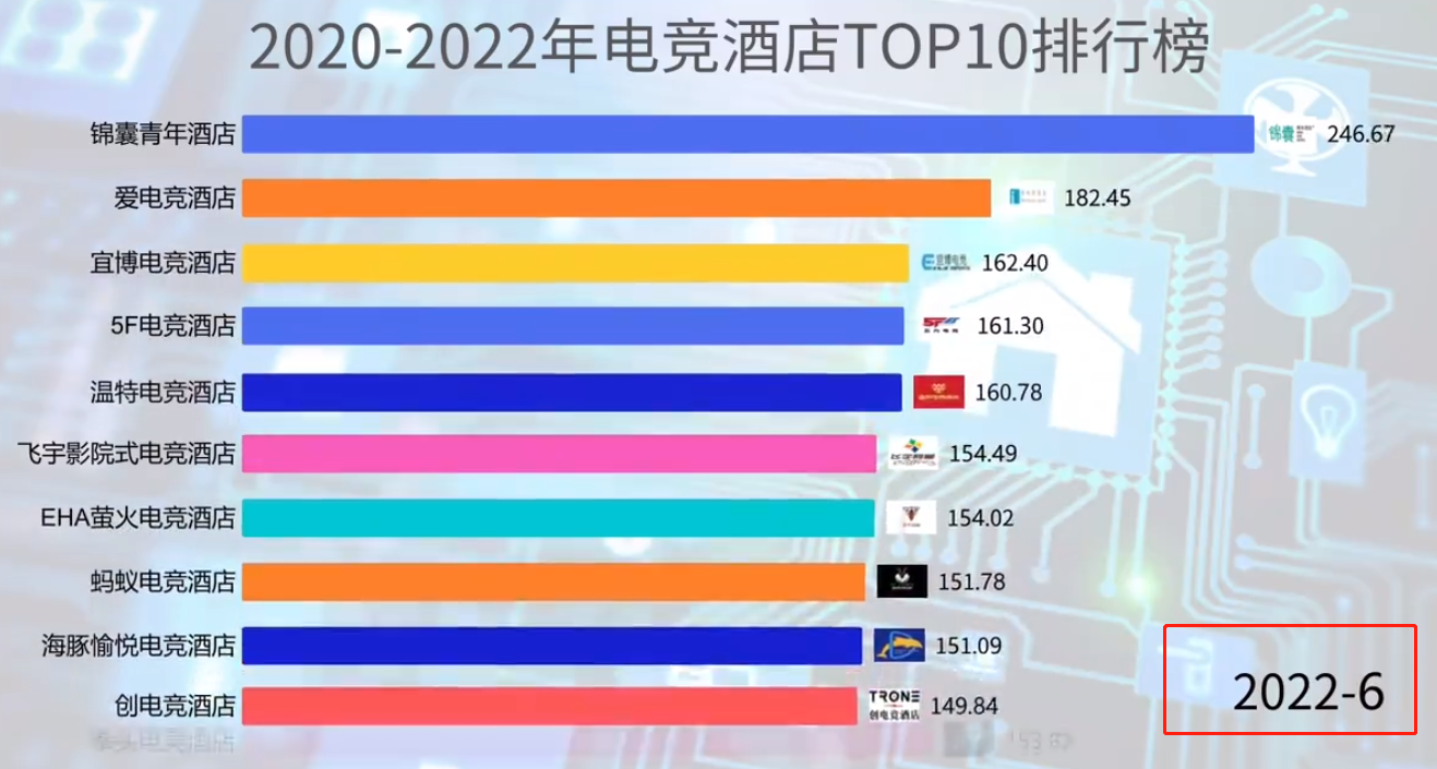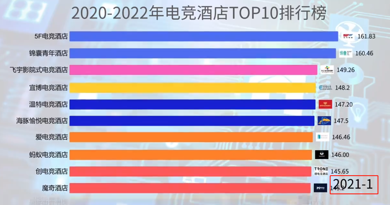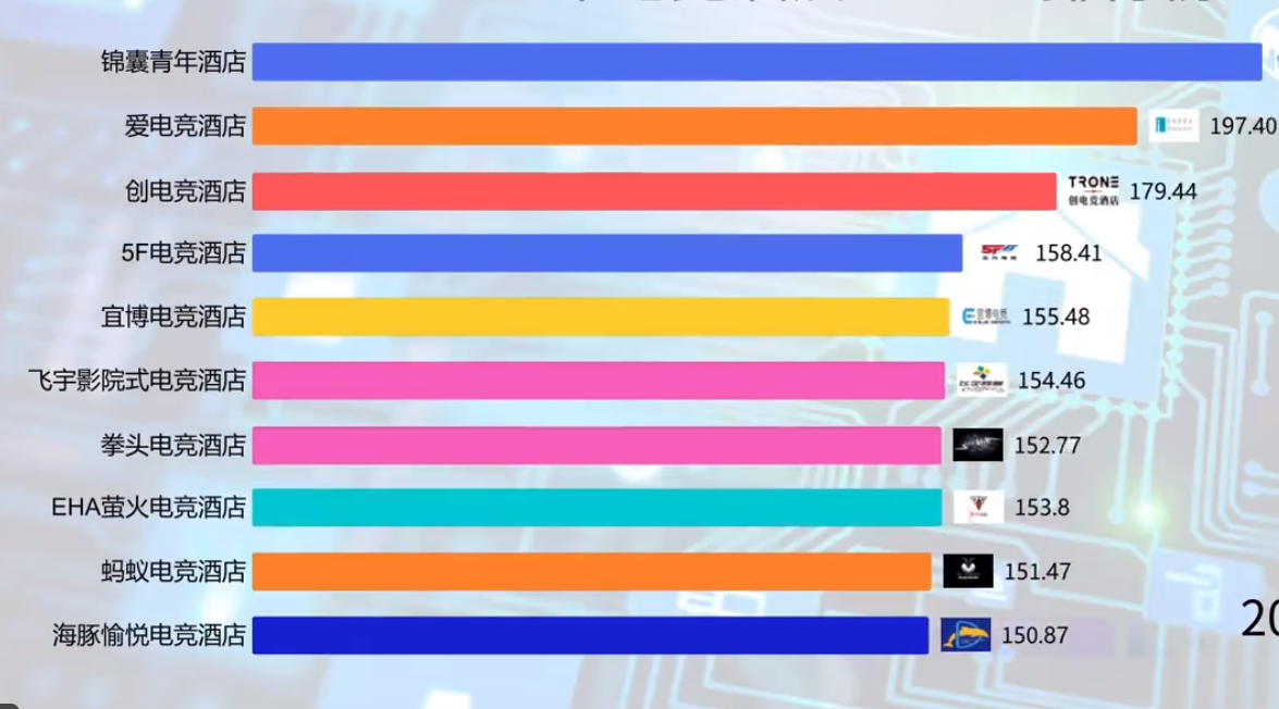 自2020年9月開始,排名第一的是魔奇電競酒店,第二名是錦囊泛娛酒店(原錦囊青年酒店)