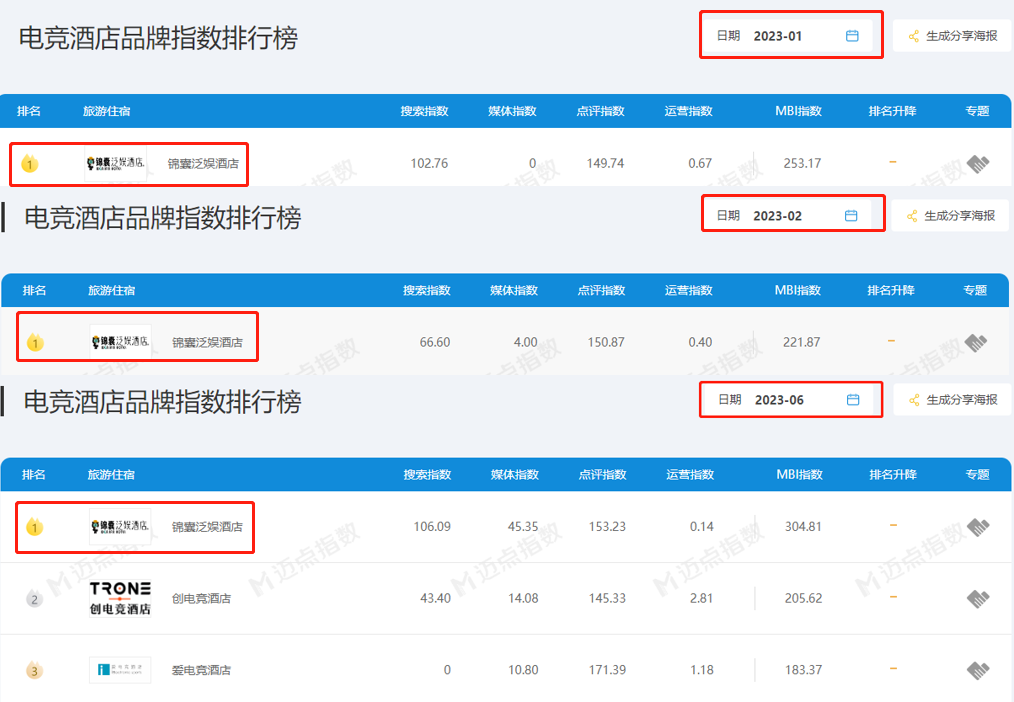 邁點(diǎn)網(wǎng)邁點(diǎn)研究院于2023年8月公布7月電競酒店品牌排行,那我們來梳理一下近三年電競酒店排名情況。