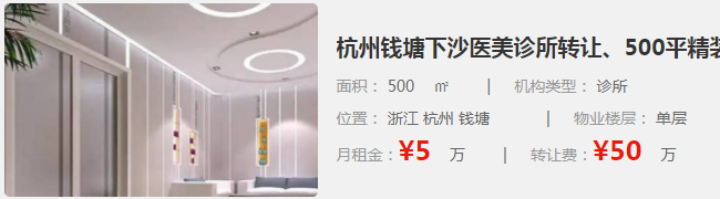 2. 杭州錢塘下沙醫(yī)美診所轉(zhuǎn)讓,500平精裝修,月租金5萬,轉(zhuǎn)讓費50萬。