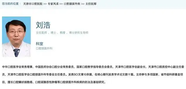 ▲劉浩個(gè)人資料。圖片來(lái)源/天津市口腔醫(yī)院網(wǎng)站截圖