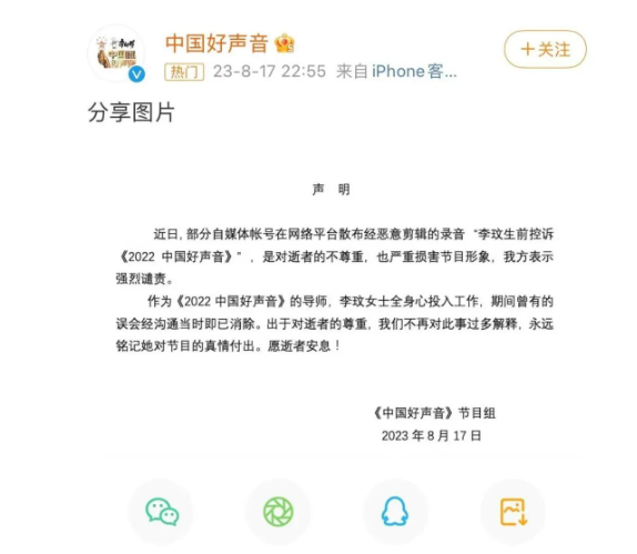作為《2022中國好聲音》的導師,李玟女士全身心投入工作,期間曾有的誤會經(jīng)溝通當時即已消除。出于對逝者的尊重,我們不再對此事過多解釋,永遠銘記她對節(jié)目的真情付出。愿逝者安息!