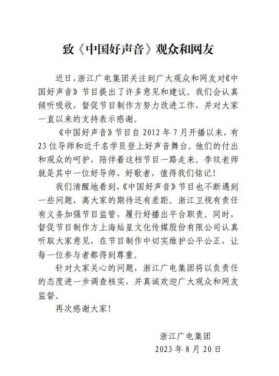 浙江廣播電視集團官網(wǎng)8月20日晚發(fā)布公告致《中國好聲音》觀眾和網(wǎng)友: