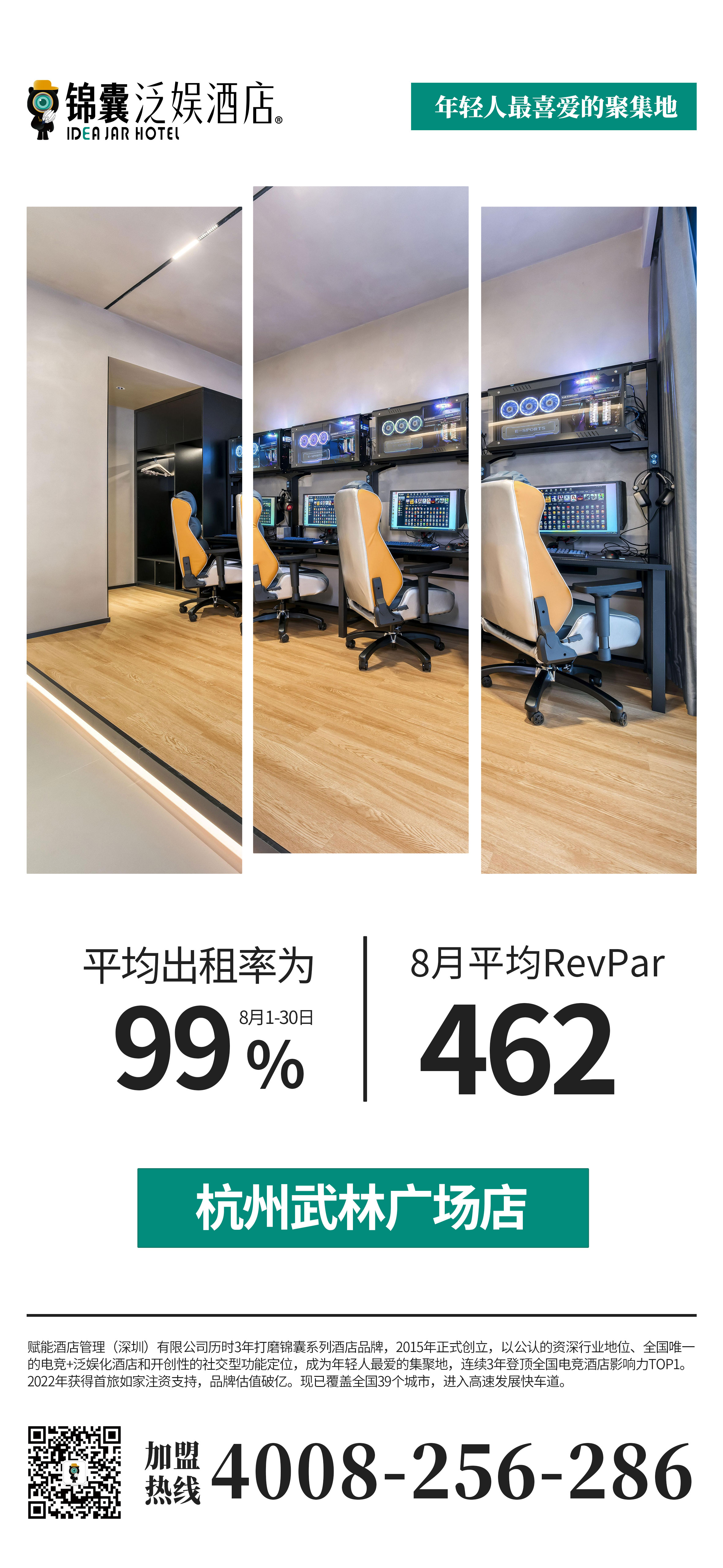 2023年電競酒店的競爭格外激烈,正是在這個過程中,推動了電競酒店行業(yè)的深而精的持續(xù)發(fā)展。電競酒店行業(yè)領(lǐng)頭羊錦囊泛娛酒店在2023年的表現(xiàn)格外醒目,繼取得連續(xù)三年登頂全國電競酒店排行榜后,還率先入圍全國酒店百強榜,是電競酒店細分賽道唯一進榜的品牌。而作為深圳電競酒店市場開拓者,錦囊泛娛酒店在2022年獲得首旅如家注資支持之后,2023年提速發(fā)展,向多個新城快速邁進。杭州亞運會召開在即,錦囊泛娛酒店也緊抓杭州亞運會電競盛事的契機,打造了杭州電競酒店單店規(guī)模最大的電競酒店——錦囊泛娛酒店武林廣場店,以一貫優(yōu)質(zhì)的服務(wù)與電競+泛娛社交模式,攬獲一眾電競愛好者的芳心。值得一提的是,經(jīng)過錦囊泛娛酒店“電競+”泛娛社交運營模式的增值賦能,錦囊泛娛酒店杭州武林廣場店的RevPar超462元,營業(yè)額更是超過杭州眾多電競酒店品牌平均水平。