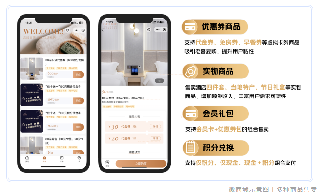 因?yàn)槲覀冏詴T后,在小程序上預(yù)訂是有積分的。而且這個積分和微商城是一個聯(lián)動的事情,會員要想兌換使用積分,也必須要到我的小程序商城上去兌換。比如說購買一些房費(fèi)優(yōu)惠券、兌換日常小商品甚至我們的電競相關(guān)的券或禮品,都是很好的沉淀會員用戶的手段,目前的話我們85%的會員都是來自小程序注冊的。