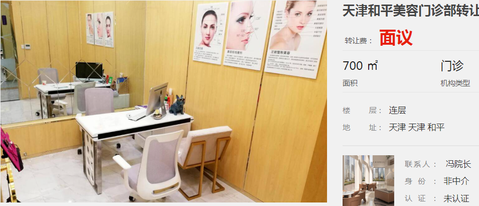 天津和平區(qū)700平方米的美容門診部轉(zhuǎn)讓,未提及月租金,轉(zhuǎn)讓費(fèi)為面議。
